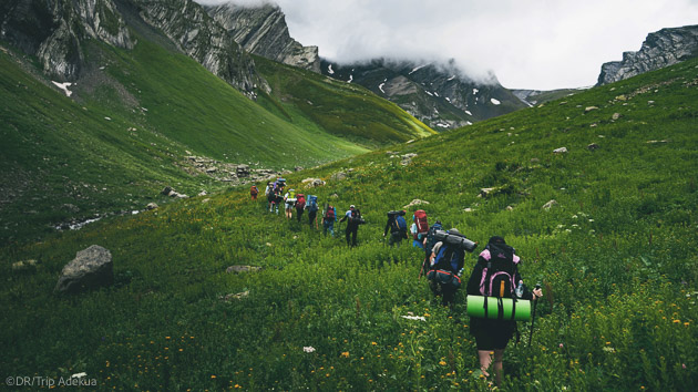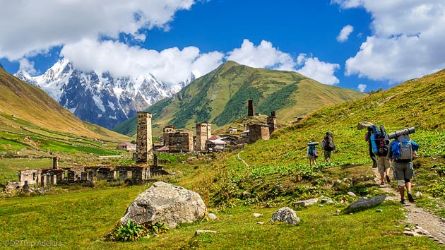De forteresses en villages médiévaux, nous marchons sur des sentiers de randonnées qui nous permettent de découvrir des paysages à couper le souffle sur les sommets du Caucase comme le mont Ouchba (4 700 mètres) ou le mont Chkhara (5 201 mètres), le point culminant du pays.