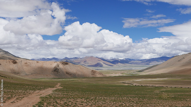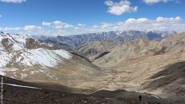 Sur le sentier qui nous mène à notre premier camp de base du Kanji La (4200 mètres), les nomades nous montrent le chemin. De col en col, nous passons par des hameaux en pierres très rustiques et des monastères perchés que nous visitons. Au bout de plusieurs jours de marche intense, nous atteignons Padum, capitale de la vallée, et profitons enfin d'une nuit dans un vrai lit... pour rêver à tous les panoramas sauvages et minéraux que nous venons de parcourir !